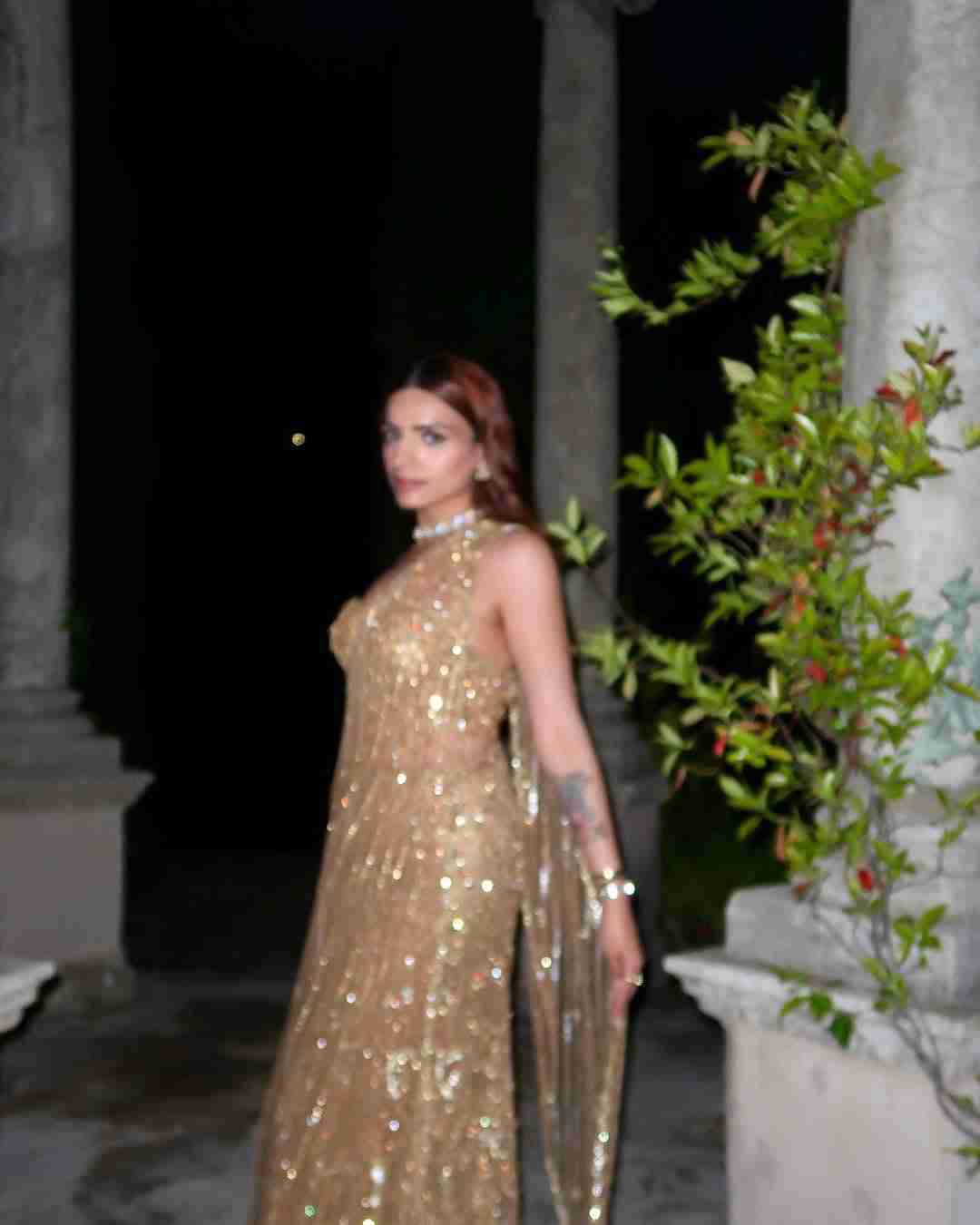 Shimmering gold pre-draped lehenga saree paired with a statement corset blouse. Tonal gold embroidery mixed with hints of red highlight the dreamy half moon motifs and dangling crystals on the drape complete this modern bridal look