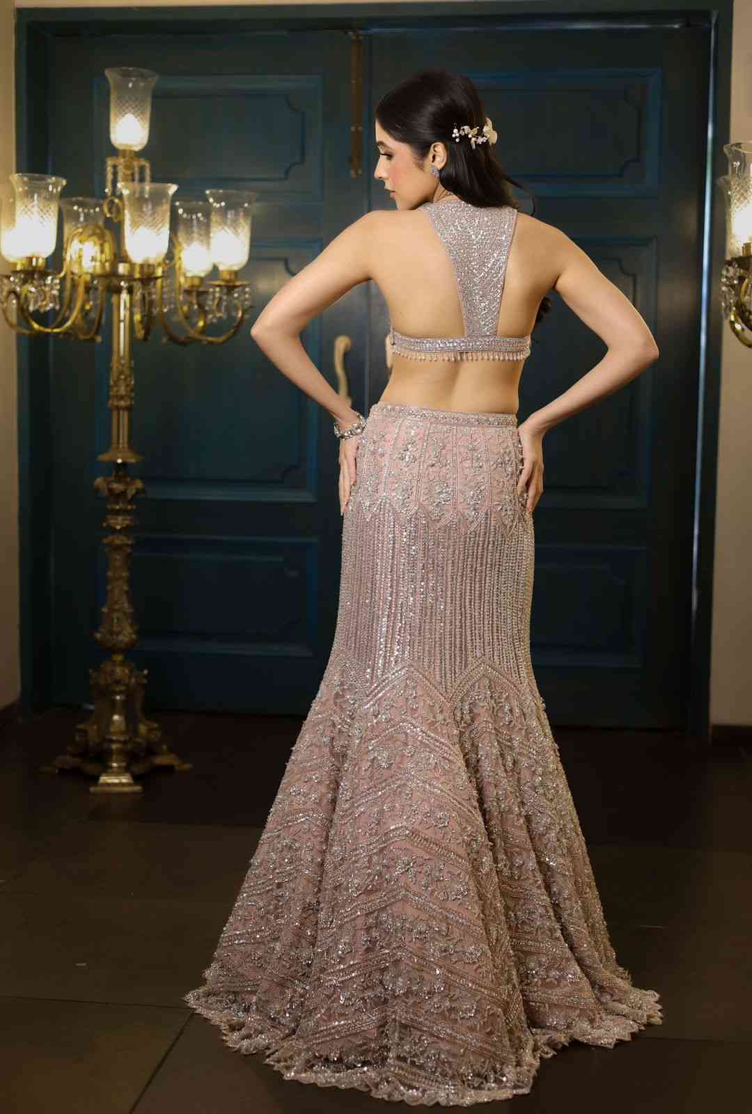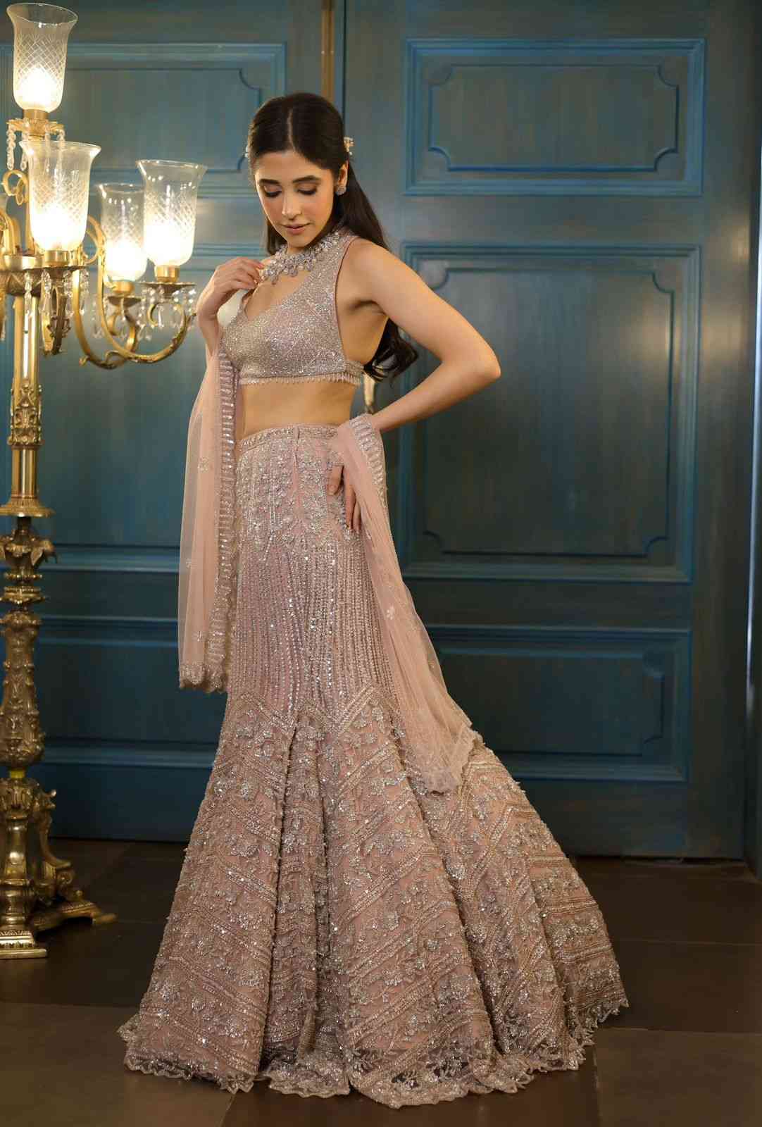 Powder pink fishcut lehenga with all over sequin,crystal,cutdana and pearl embroidery.Paired with a statement strappy embroidered racer back blouse and matching dupatta. This look can be paired with an additional cape jacket replete with delicate embroidery and flowing tassels.